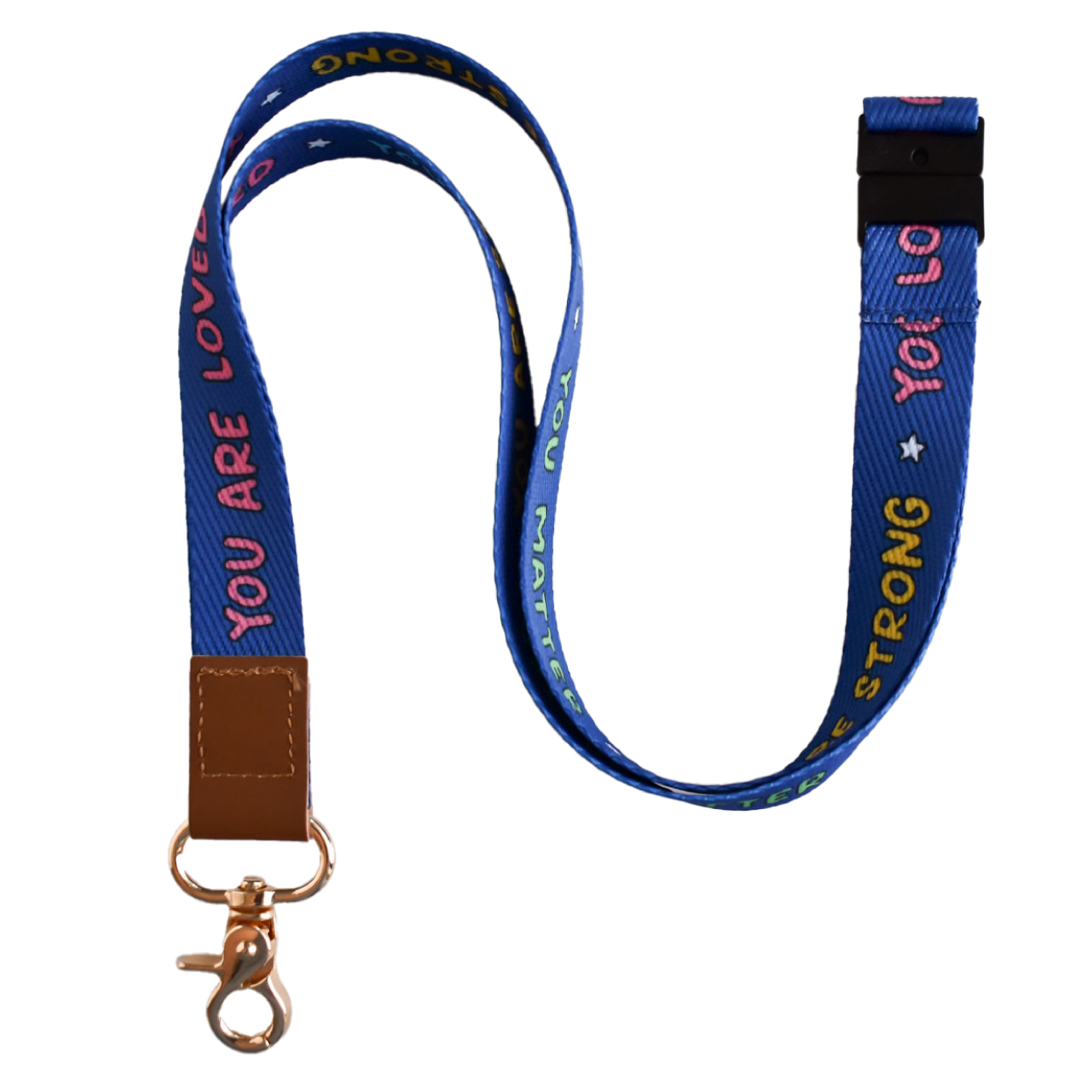if you could see it IRL: 19" long, 0.75" wide full-color lanyard. Includes breakaway safety clasp and gold lobster claw clasp.