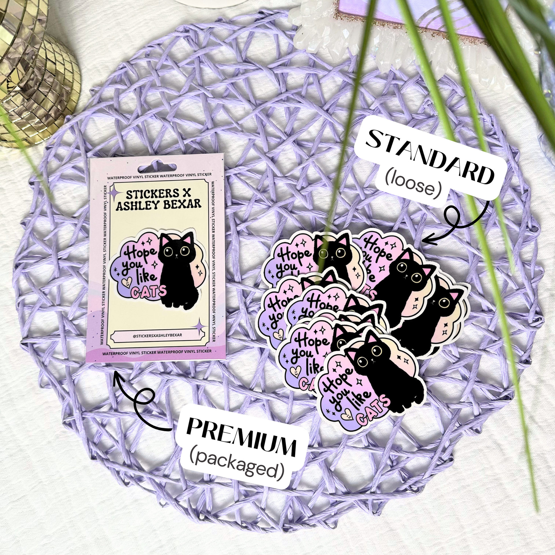 1. Standard: Stickers are provided “loose” with my branding featured on the backs. This option is ideal for those who have a designated sticker display.