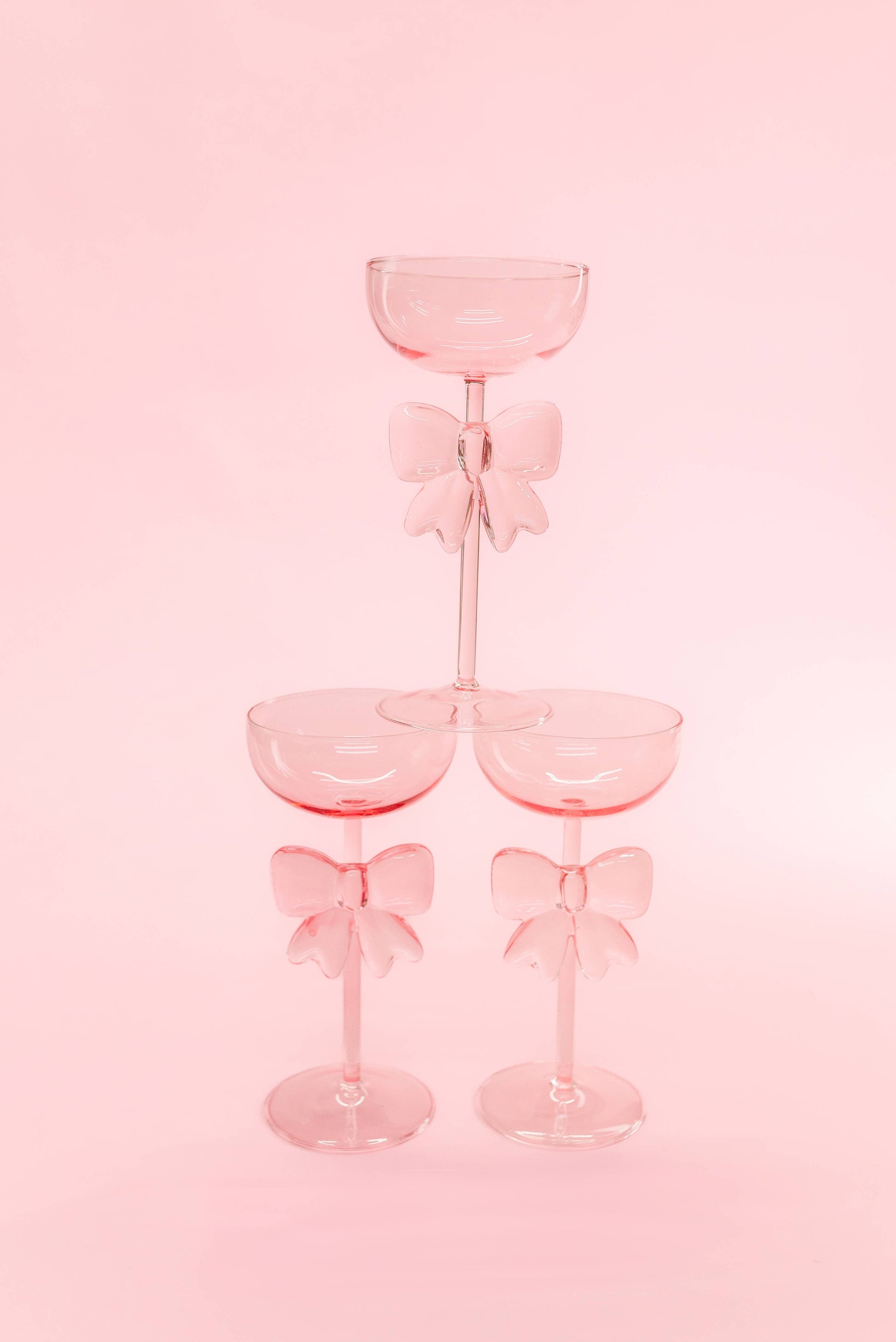 glassware, coupe glass, cocktail glass, champagne coupe, pink glass, bow glass, decorative glass, drinkware, entertaining, dining, hostess gift, bridal shower gift, bar cart accessories, feminine, girly, holiday gift, barware, trending, trendy, toasting, toast, cheers, coquette