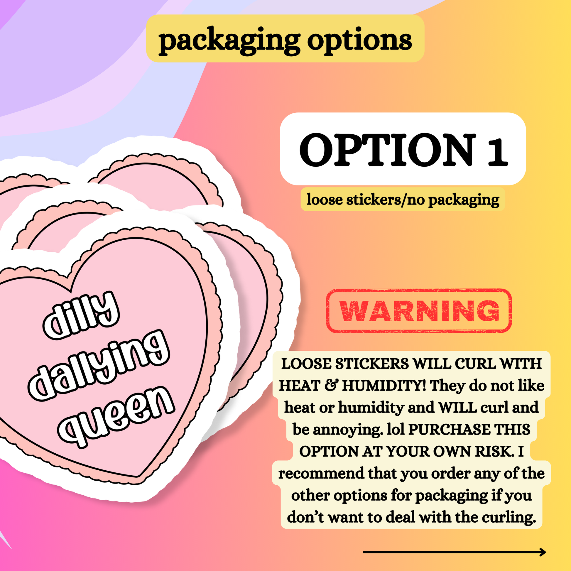 All stickers measure 3" in size, determined by height or width, whichever is larger.
