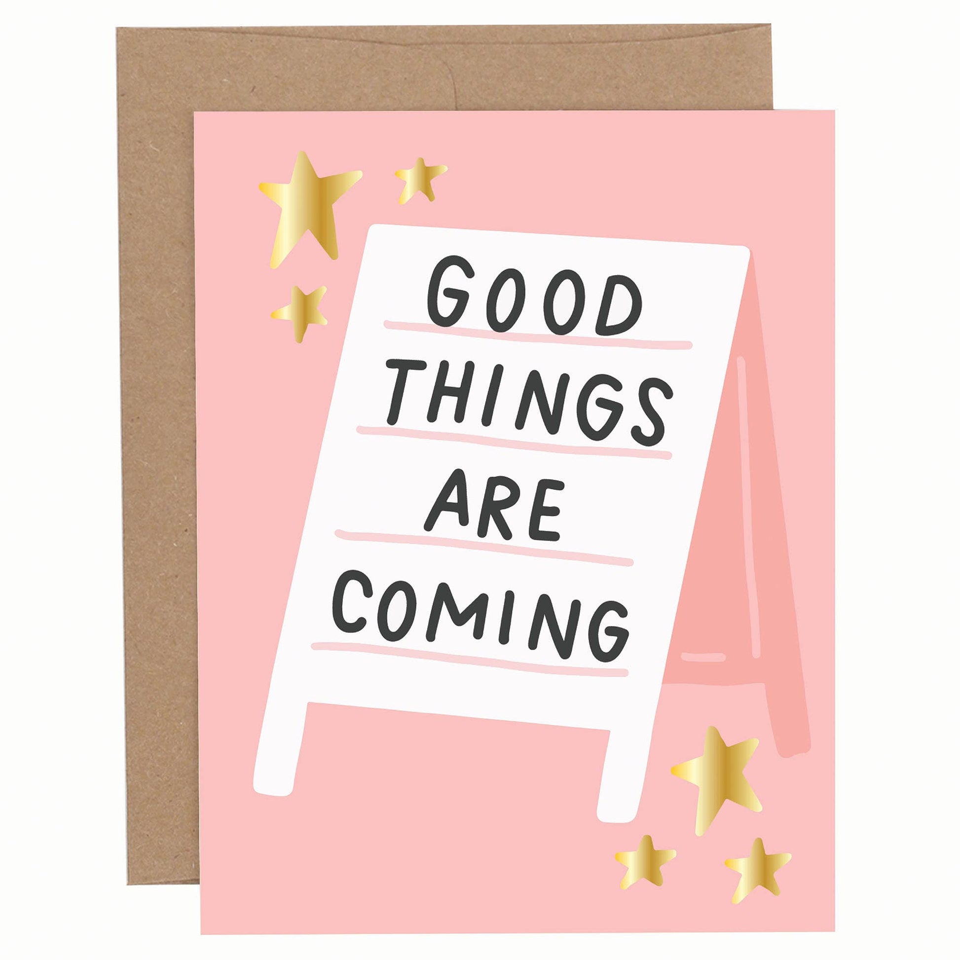 This is your sign that Good Things Are Coming! Perfect for lifting spirits and providing a dose of positivity, this greeting card reminds them that brighter days are ahead. Whether they're facing a challenge or pursuing their dreams, send your support and encouragement with this uplifting card.