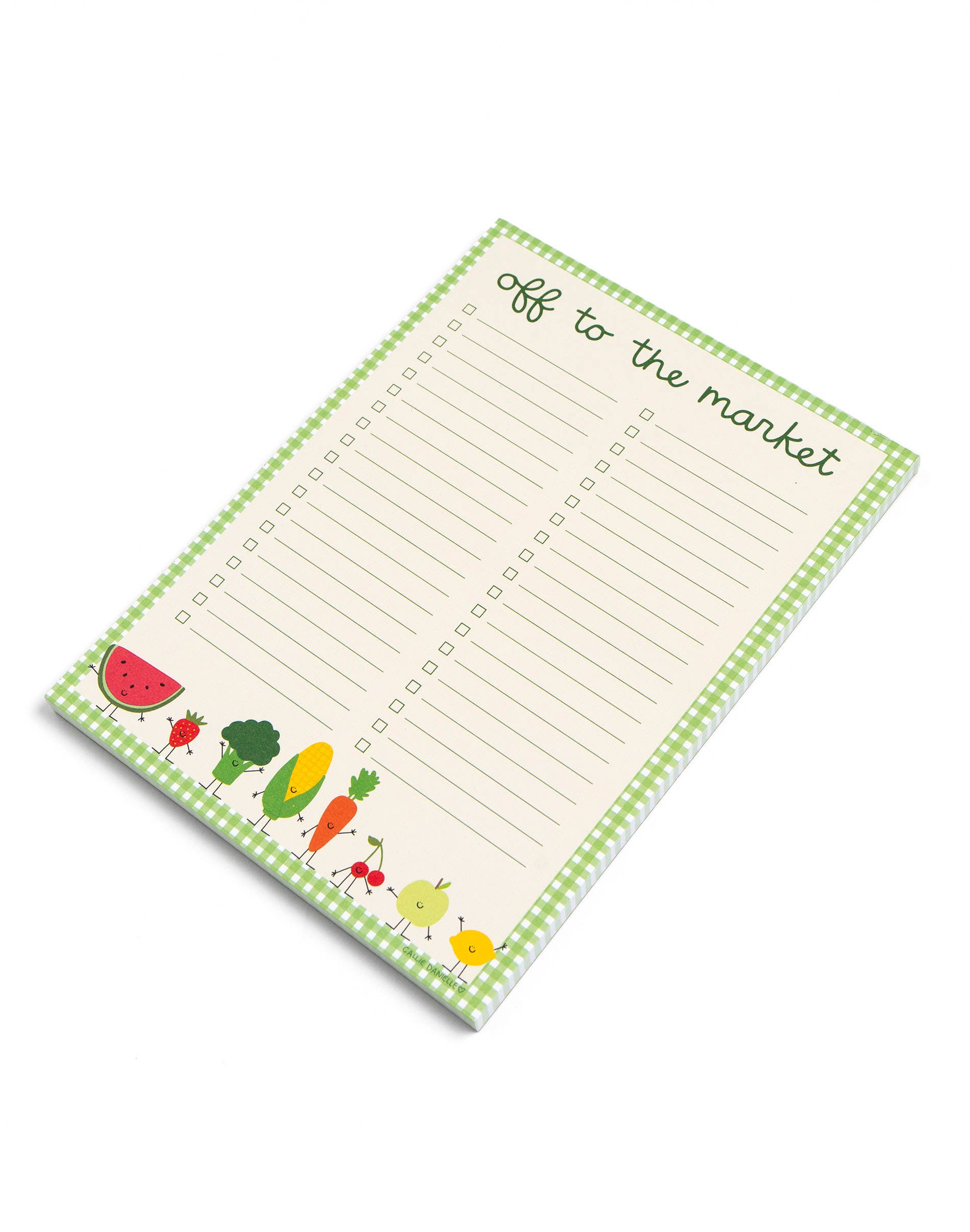 Never leave the grocery store empty handed! This light yellow, lined, fruits and vegetable  themed notepad features a wide variety of doodles of  farm fresh favorites like watermelon, strawberries, corn, carrots, cherries, apples and lemons . With 52 lined sheets, this notepad is perfect for grocery lists, meal planning, brainstorming, to-do lists, or even weekly planning!