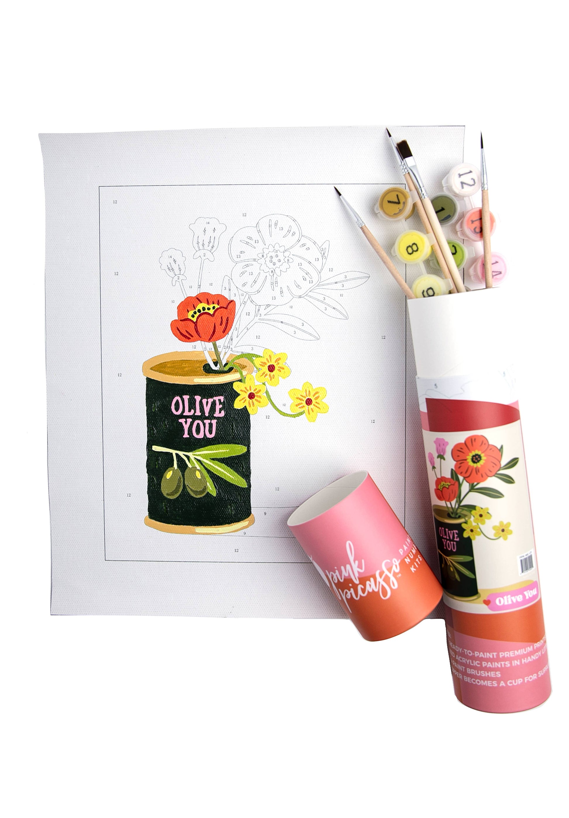 Olive You is the punniest little paint by numbers kit your heart (and your wall) could ask for. This 8x10 canvas features a vintage-style olive can turned vase, brimming with cheerful blooms and topped with a sweet message of affection. It’s the perfect blend of quirky, cute, and crafty.