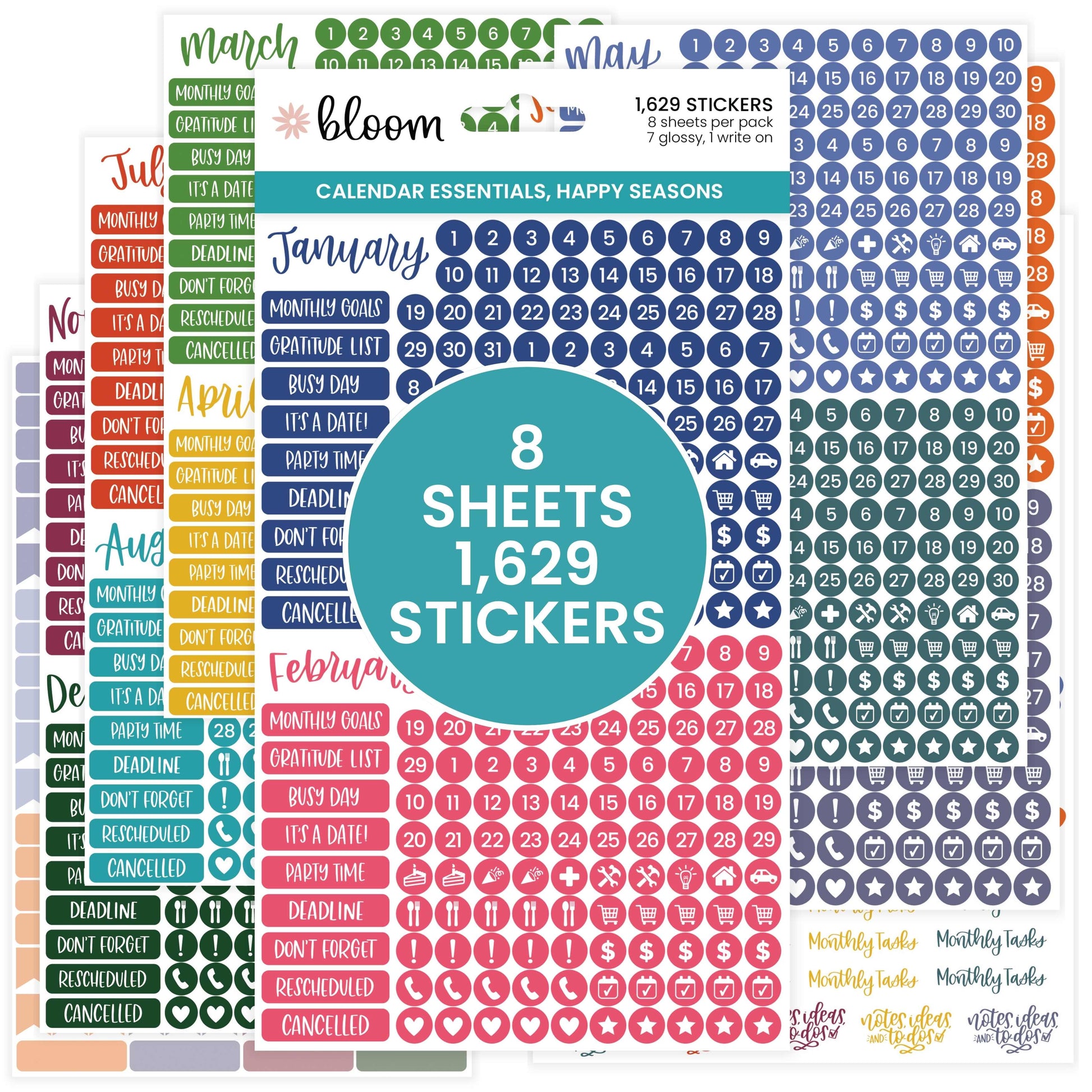 • Each month features 1 large and 5 smaller monthly headings, two sets of daily numbers for dating your planner's monthly and weekly views, various color-coordinated headings, and .32" dot icon stickers