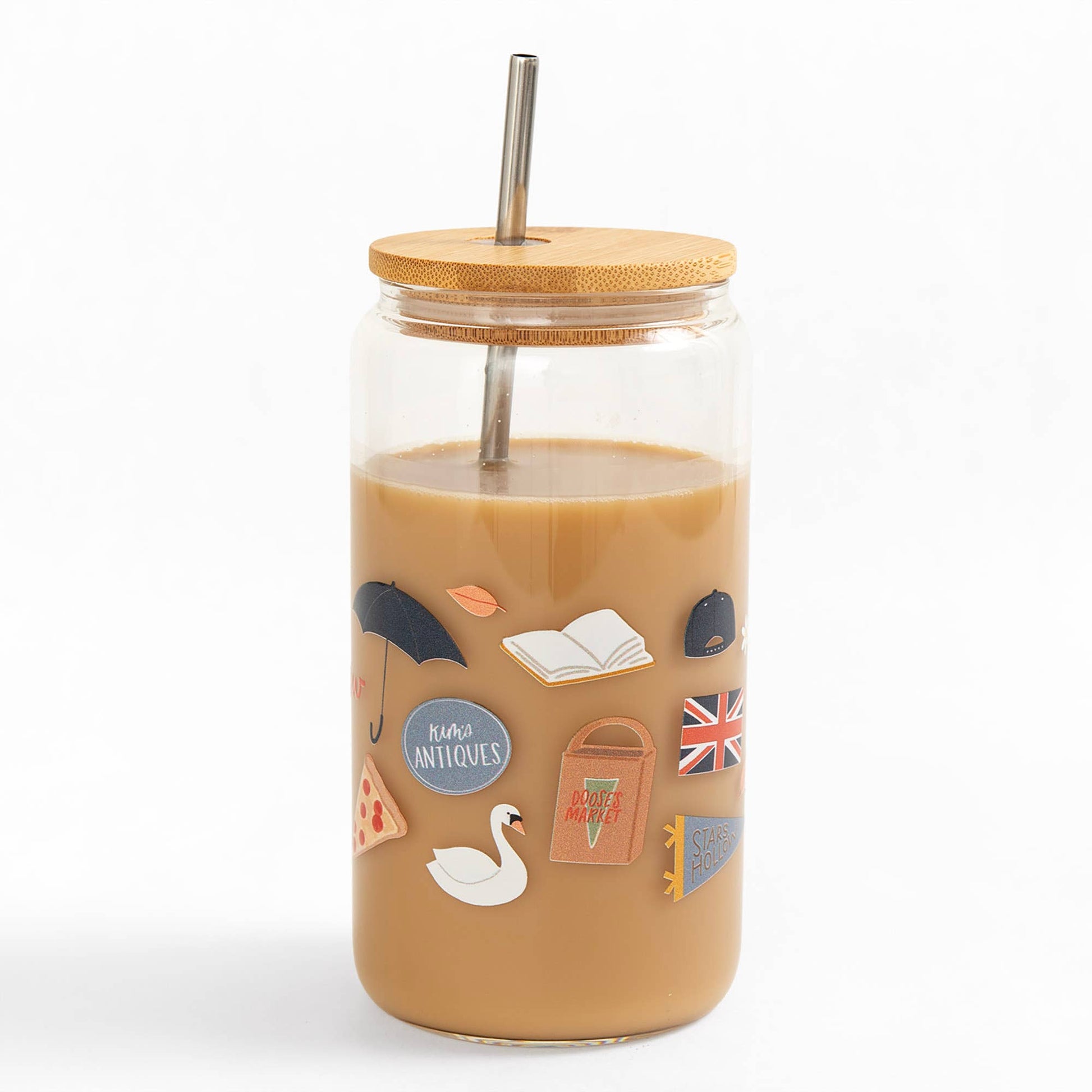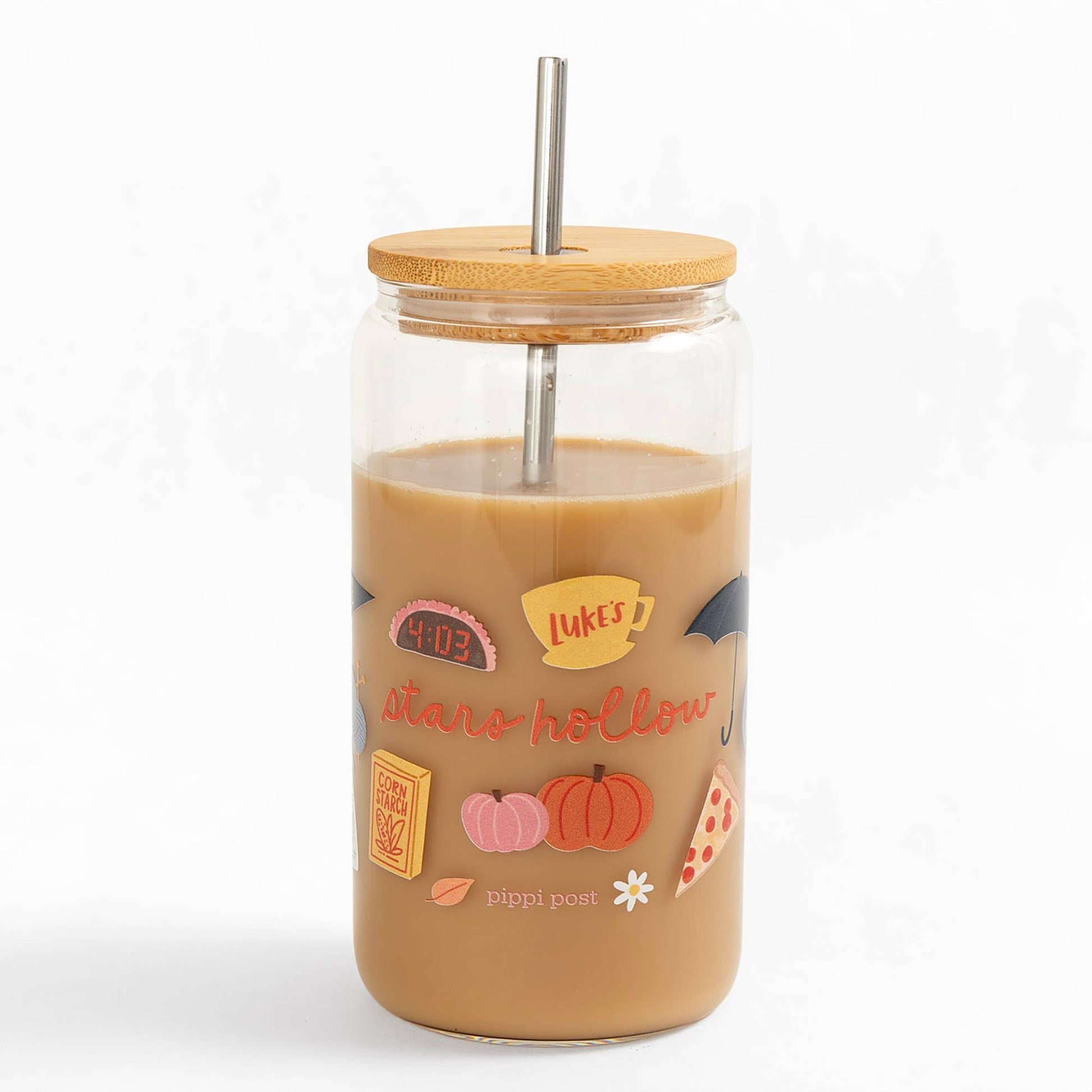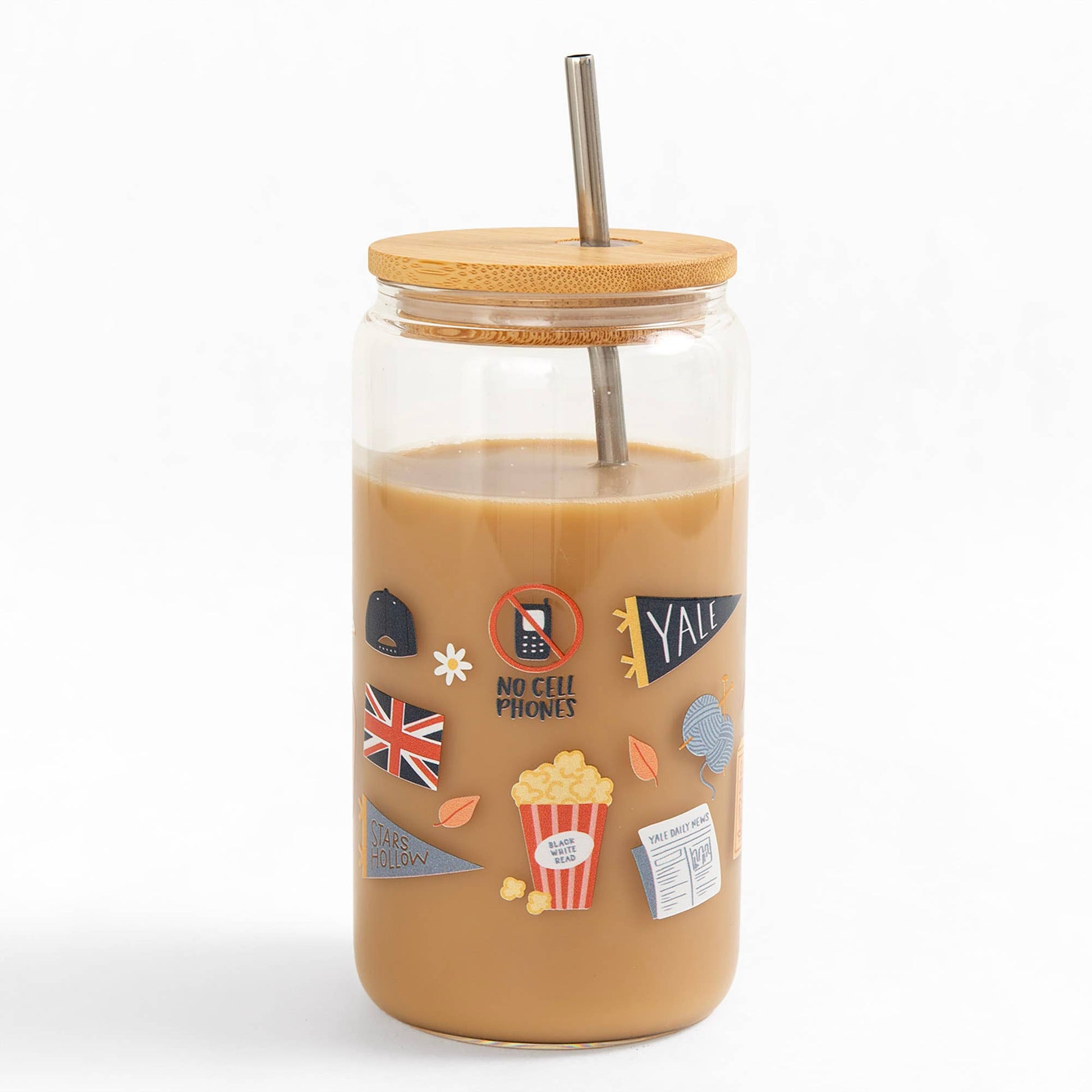Bring a piece of Stars Hollow to your beverage with our Stars Hollow in the Fall Glass Can! Featuring charming hand-illustrated icons from Gilmore Girls, including a Yale banner, pumpkins, a book, umbrella, swan, pizza, and more, this glass can captures the cozy spirit of the beloved show. Whether you're sipping your morning coffee, afternoon tea, or a refreshing sparkling water, let the nostalgia of Stars Hollow accompany you. Ideal for Gilmore Girls fans or anyone who loves small-town charm, our Stars Hollow in the Fall Glass Can makes a great gift for birthdays, holidays, or any special occasion.