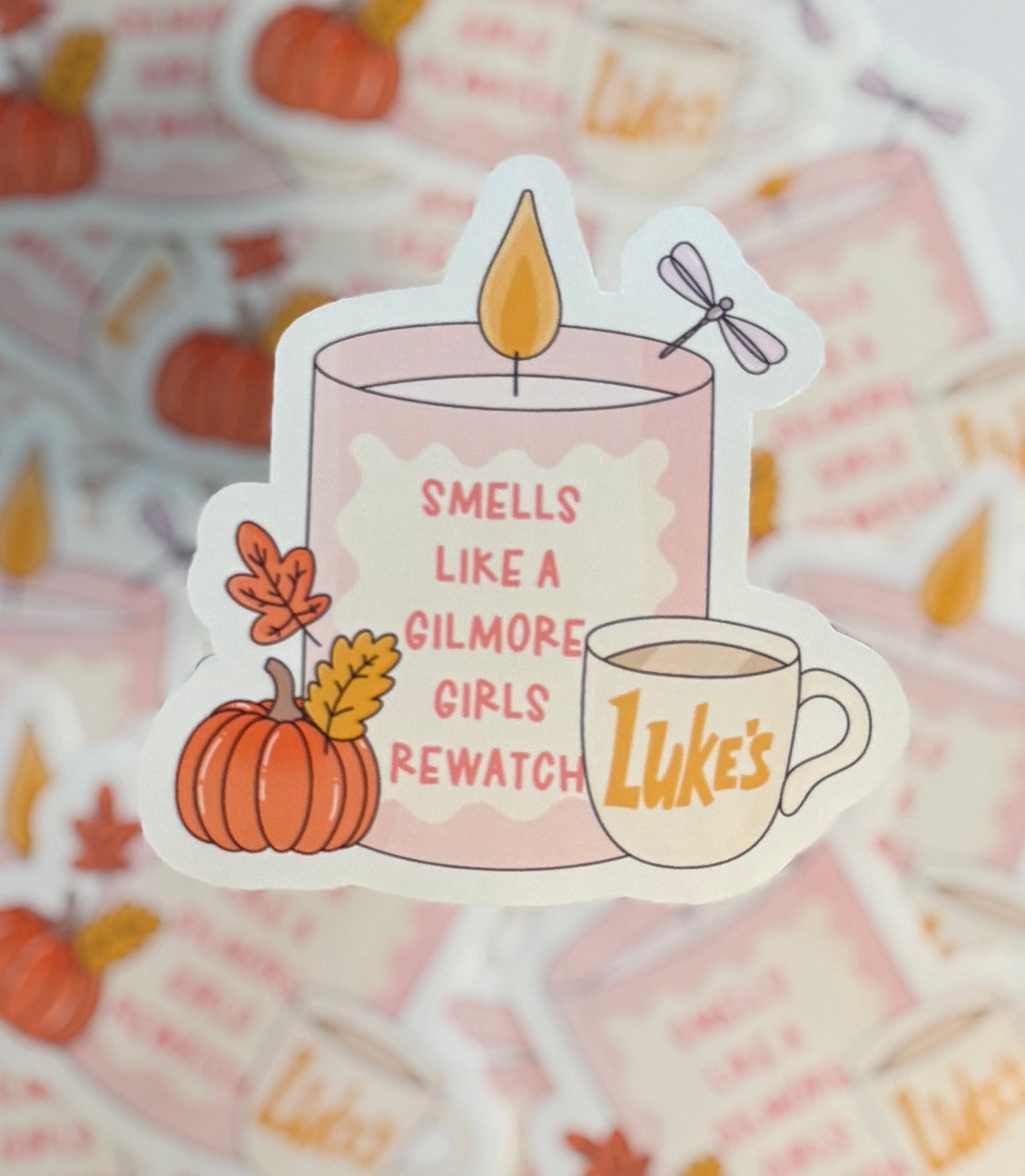 Cue the coffee, cozy sweaters, and small-town charm — this sticker captures the ultimate fall vibe. Featuring a candle labeled “Smells Like a Gilmore Girls Rewatch” alongside a steaming Luke’s Diner mug, a pumpkin, and autumn leaves, it’s perfect for fans who thrive on caffeine, fast talking, and cozy nights in Stars Hollow.
